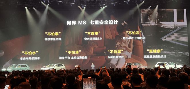 在安全方面,余承东花了非常大篇幅介绍,问界 M8 带来了七重安全设计,六个不怕和一个更:不怕事(硬核车身结构)、不惹事(全向防碰撞 3.0)、不怕冻(零下 40 摄氏度正常启动)、不怕水(车内外都防水)、不怕滑(途灵平台主动防滑控制)、不怕腐(五星防腐设计)和更健康(五星健康座舱设计)。