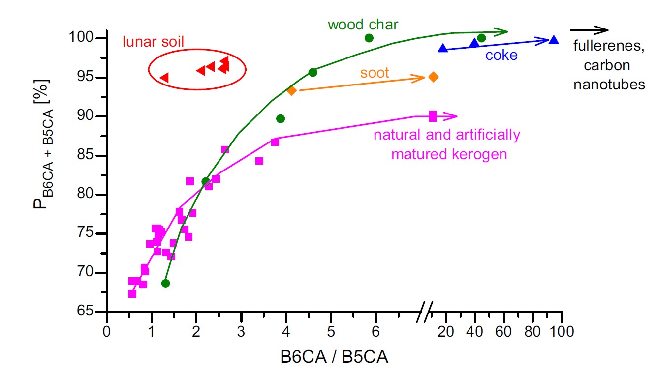 研究团队发现,相比于地球类似物(如木炭、烟炱、干酪根等黑碳物质),由月壤样品中的稠环芳香物质所衍生的苯多羧酸分子组成具有鲜明的特异性,芳环稠合度极高,呈现出与 4 纳米大小石墨烯相类似的结构特征。进一步地,研究团队测定了月壤样品中稠环芳香物质所衍生的苯多羧酸化合物(B6CA、B5CA)的单体稳定碳同位素组成(δ13C),其值为:–5.0±0.6‰至 +3.6±1.3‰,这显著高于地球有机质的δ13C值,排除了月壤中稠环芳香物质来自地球人为污染的可能性。