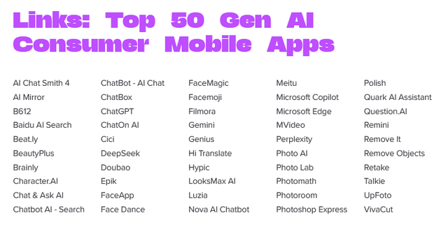 GameLook 报道/在 A16Z 发布的第四版 2025 年 Top 100 AI 消费级移动应用当中,AI 伴侣类应用剋以说占据了大半壁江山,其中由 Vulcan Labs 开发的《AI Chatbot: AI Chat Smith 4》甚至超过了百度、ChatGPT、DeepSeek、豆包等一众应用,成功实现登顶。