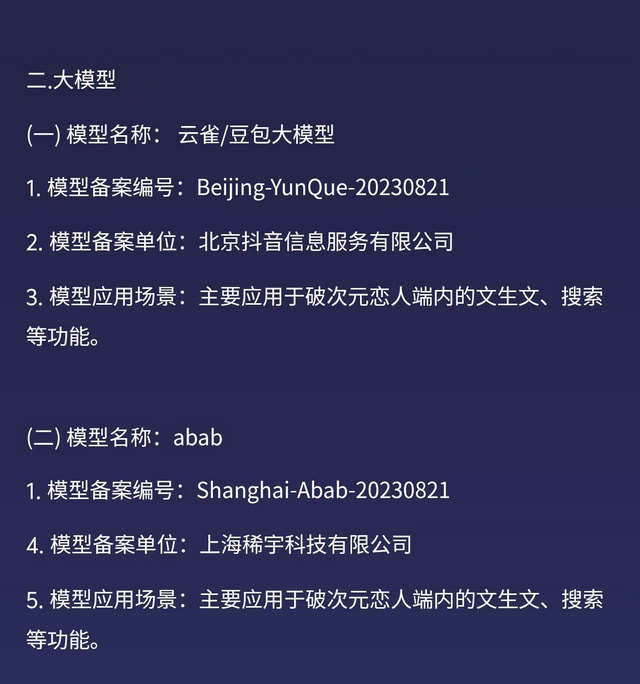 但是在使用的过程中,GameLook 发现,《破次元恋人》作为网易的产品,一方面没有选择使用网易自家的伏羲大模型,根据官方公示,应用的底层大模型其实是字节跳动的云雀/豆包大模型以及 MiniMax 的 abab。
