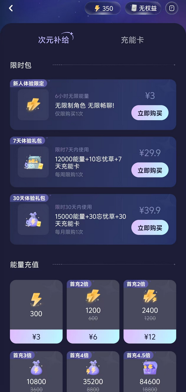 只不过在商业模式上,《破次元恋人》采取得以就是常见的卖 Token 的设计,玩家每次与应用中的角色对话就会消耗 10 能量,用户可以直接购买“能量值”或者购买“充能卡”获取额外的能量。