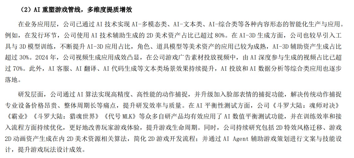 其中,年报中关于 AI 应用的表述尤为引人关注:当前 AI 技术已经重塑三七互娱游戏管线,其中在发行环节,使用 AI 技术辅助生成的 2D 美术资产占比已超过 80%、AI-3D 辅助资产生成占比也已超过 30%。在客服、翻译、代码等文本类场景中,AI 效能持续提升,并逐步在投放和数据分析等领域实现落地。