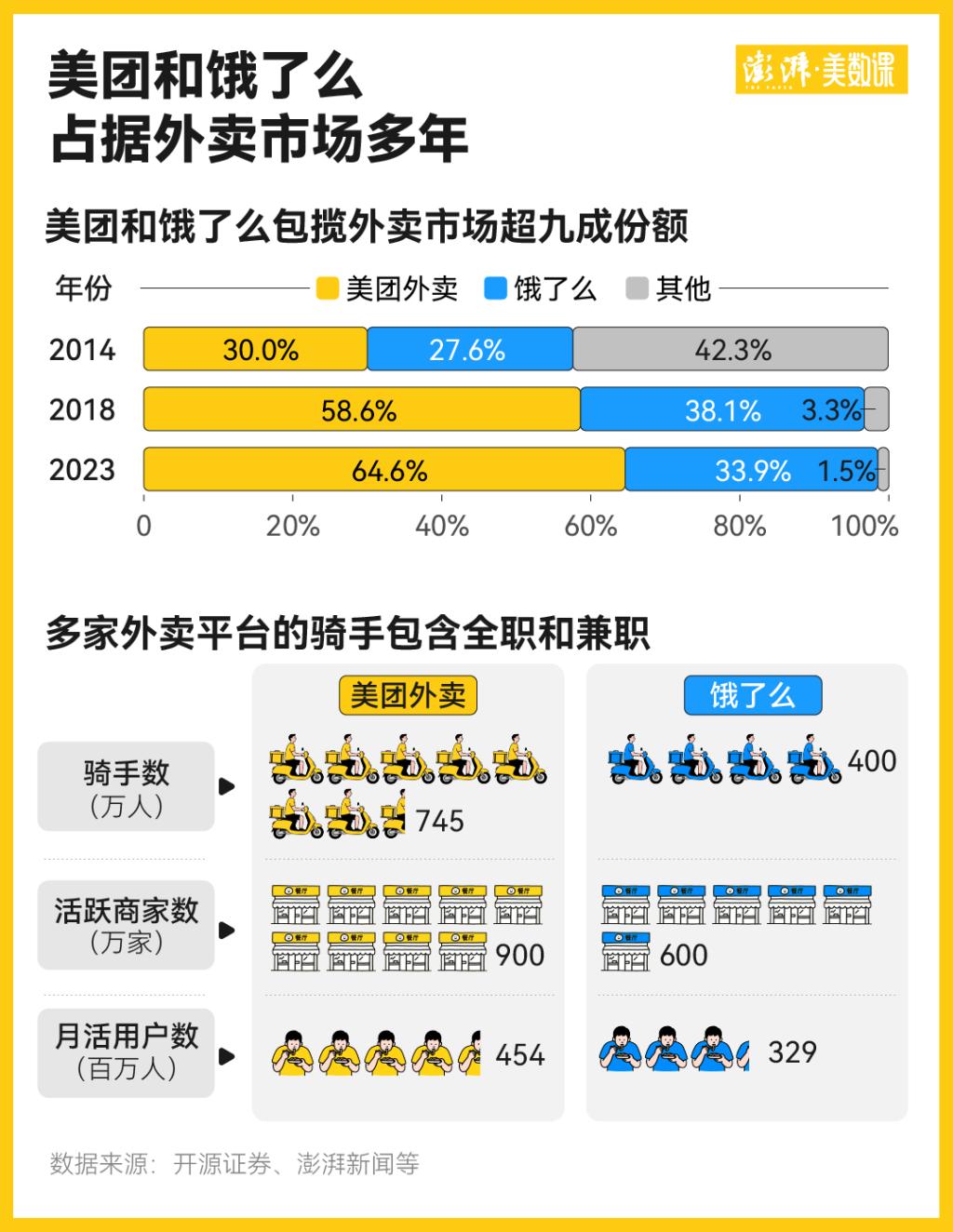 据开源证券,从 2014 年到 2023 年,美团在外卖市场的占有率已经从 30% 升至 64.6%。其中,美团在 2023 年拥有 745 万骑手数。