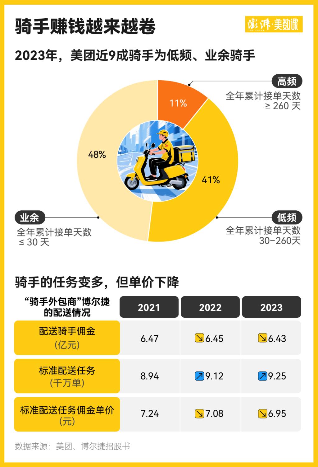 据美团 2023 年的统计数据,在 745 万名骑手中,有 80% 以上的骑手是兼职骑手,只有 11% 的人全年接单超过 260 天。与此同时,约 48% 的骑手全年接单不足 30 天。