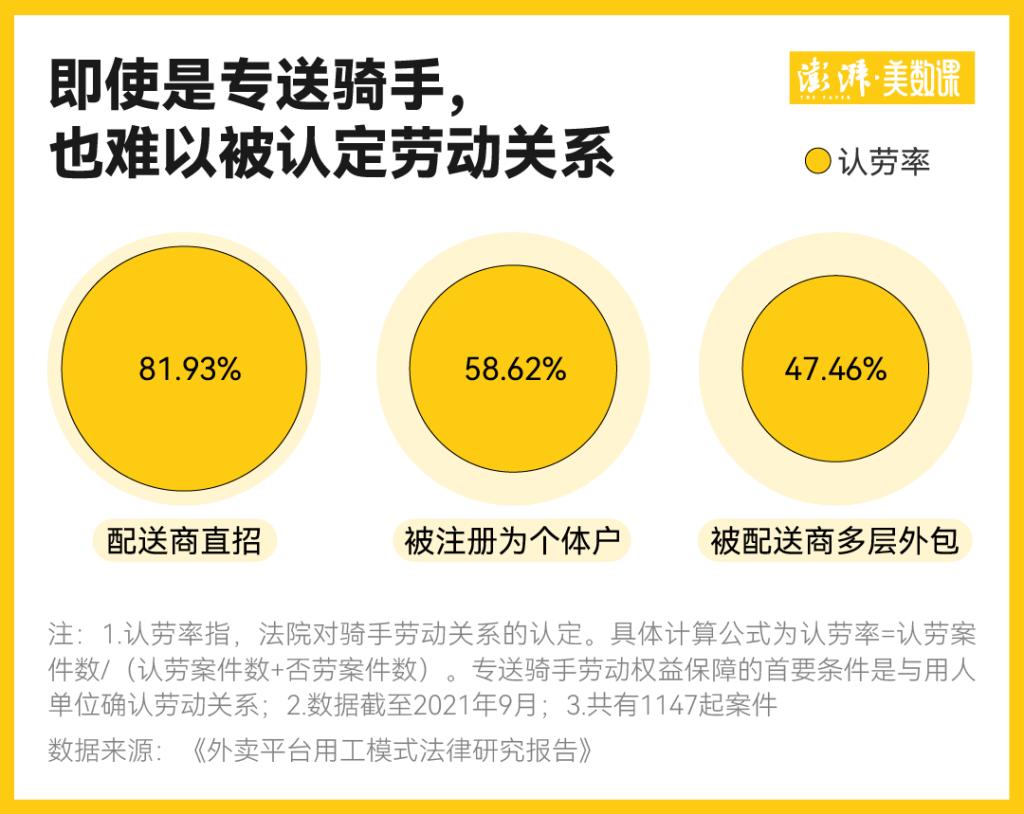 数据显示,在被配送商多层外包的骑手案件中,仅有 47.46% 的案件能认定骑手的劳动关系。