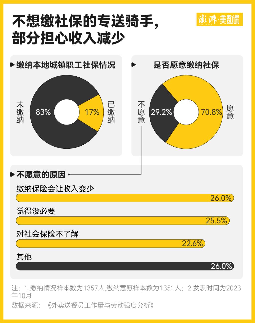 首都经济贸易大学劳动经济学院课题组调查了 1300 多名专送骑手后发现,有 29.2% 的专送骑手不愿意缴纳社保,原因主要包括会让收入变少、觉得没必要、对社保不了解等。