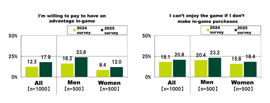 当被问及是否同意“我愿意花钱在游戏中获得优势”这一说法时,17.9% 的参与者表示同意。在所有男性参与者中,23.8% 的人同意这一说法,比去年的结果高出 7.6%。在 2024 年针对同一问题的调查中,只有 16.2% 的男性回答“是”。至于“如果不在游戏中进行消费,我就无法享受游戏”这一说法,20.8% 的受访者表示同意,比去年增加了 2.7%。