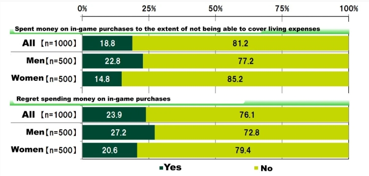 结果令人惊讶,18.8% 的参与者表示 “他们曾在游戏内购买上花费过多,以至于无法负担生活费用”,在所有受访者中,23.9% 的人承认后悔在游戏内购上花钱。