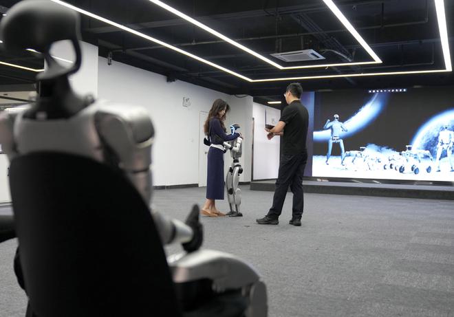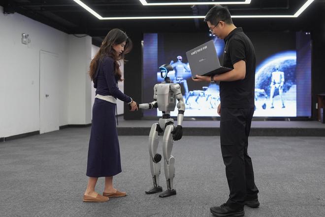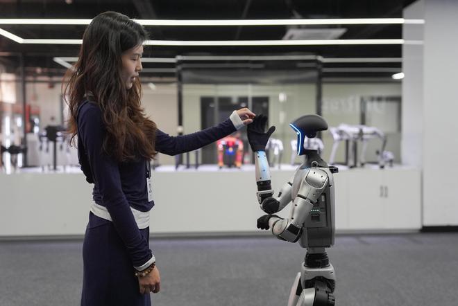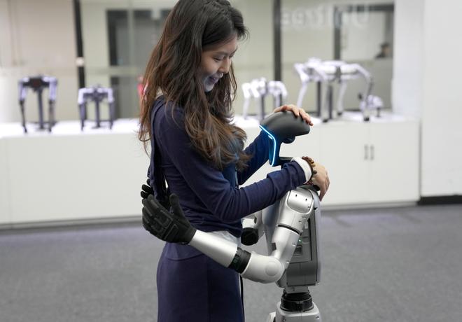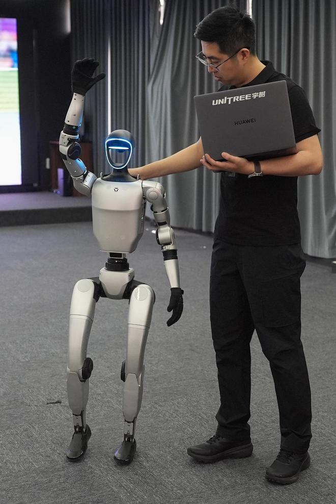 4 月 23 日,在知名机器人公司杭州宇树科技展厅内,宇树人形机器人 G1 展示本月更新的拥抱、飞吻、“光波”等动作。