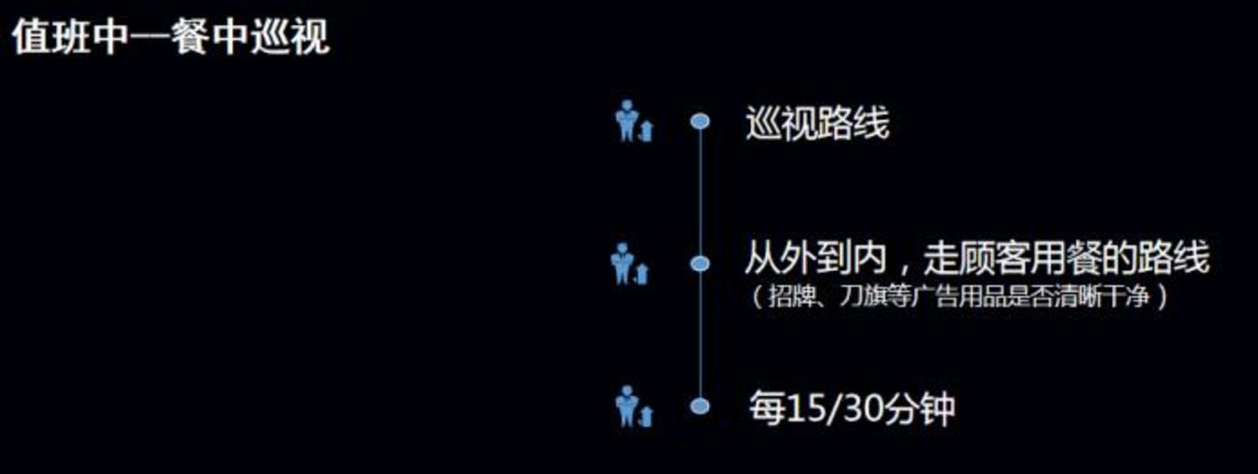 值班时,值班经理一定不能坐在工作站,要跟顾客聊天和员工聊天,眼里要能看到所有的程序。值班经理是追踪者,公司制定的所有标准没有追踪就等于0。