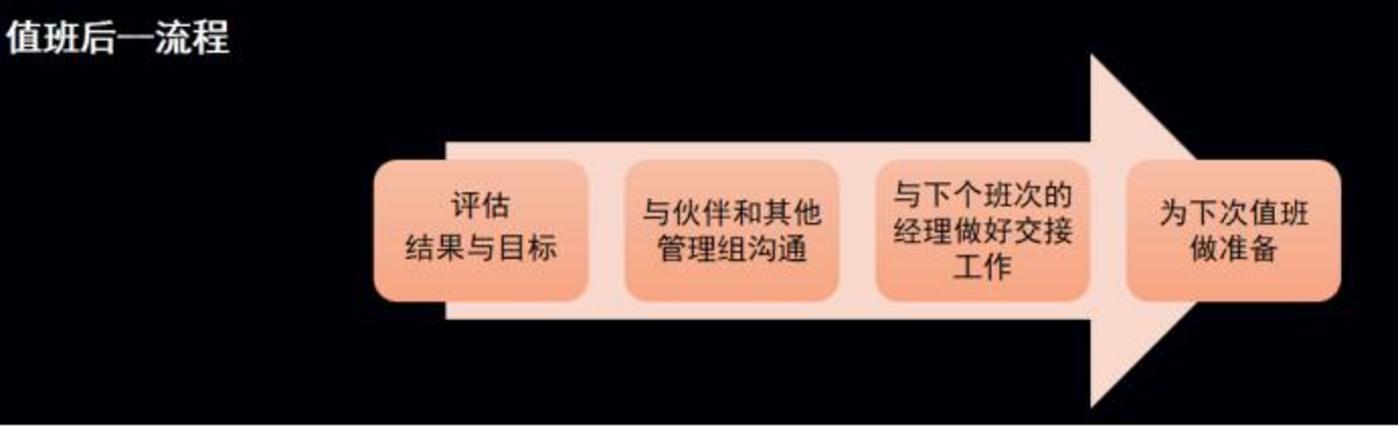 值班管理时各位还要思考:每一个环节我们要做什么事、达成怎样的目标。