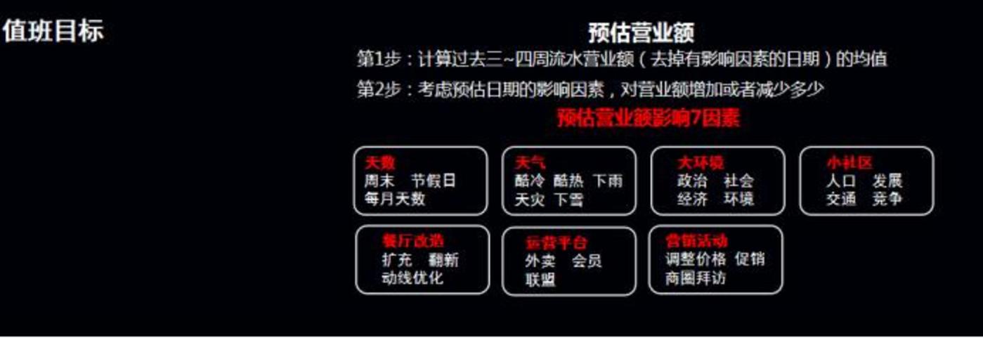 第六,预估营业额。营业额的影响因素有天数、天气、大环境、小社区、餐厅改造、运营平台、营销活动。