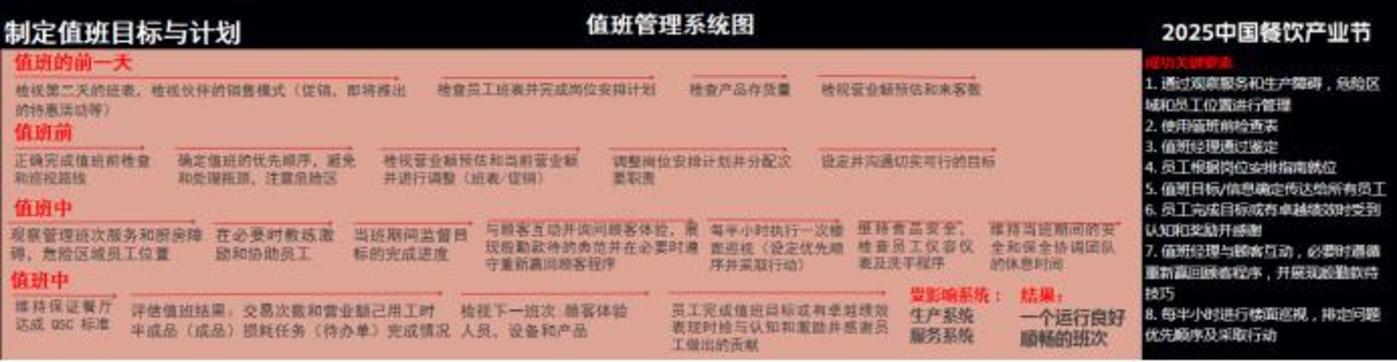 当人员、物料、设备、生产程序都到位时,顾客自然会来,营业额目标自然会达成,楼面运营也自然顺畅。如果当日营业额未达标,门店需及时补救,例如上街派发传单等。我当年担任麦当劳门店经理时每 15 分钟复盘一次,因为复盘间隔越短,调整见效的机会越大。值班管理的核心好处在于维持 QSC(品质、服务、清洁)的稳定。