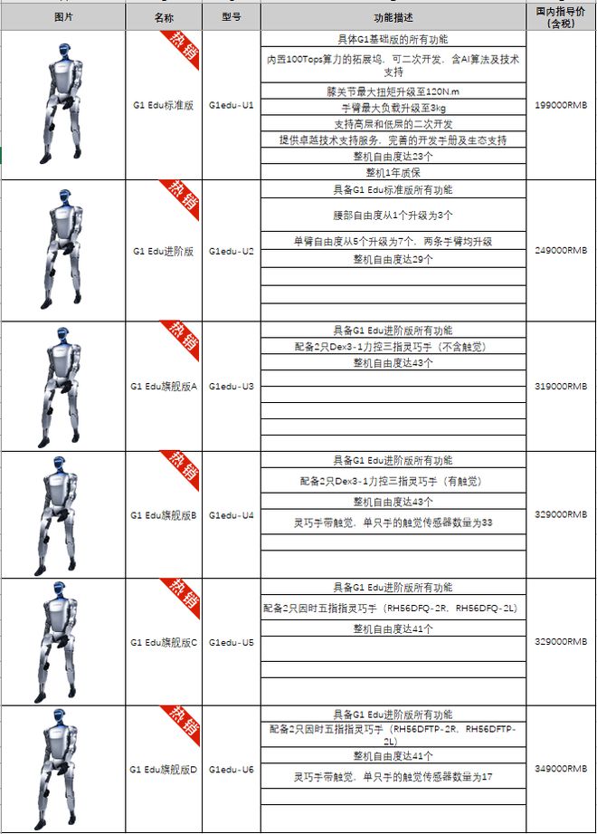 宇树 EDU 系列功能描述及价格表(来源:机器人租赁商)