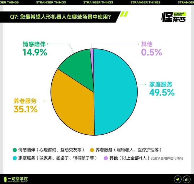 在本次问卷调研的 208 名普通消费者中,84. 6% 希望人形机器人可以在家庭服务或养老服务中使用。对于机器人在未来生活中扮演的角色,“好用的工具”成为近一半消费者的首选。