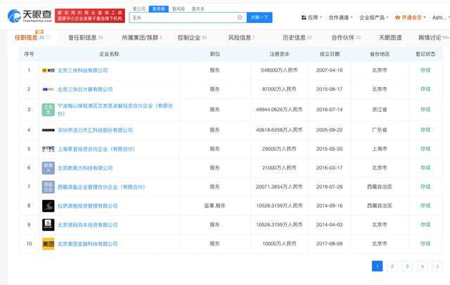 记者梳理天眼查发现,王兴名下有 30 余家企业,其中大多数为存续状态,包括北京三快科技有限公司、北京三快云计算有限公司、宁波梅山保税港区艾克思求解投资合伙企业(有限合伙)等,版图涉及科技、云计算、投资管理、企业管理等。