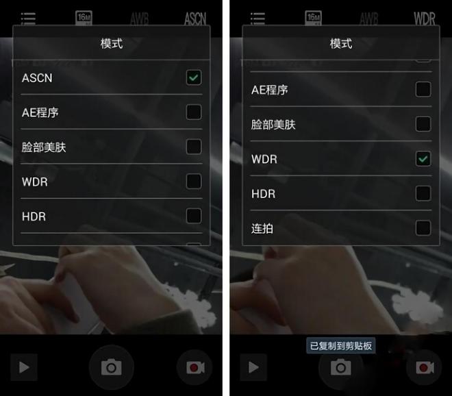 除了自动的 ASCN 模式之外,点击左上角的按钮,就可以切换拍照模式,分别为 AE 手动模式、脸部美肤模式、适用于逆光环境下的 WDR 模式和适用于复杂光线环境下的 HDR 模式。