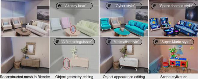 借助 DP-Recon 的生成式先验,用户可以轻松实现基于文本的场景编辑,如图 6 所示。就像为 3D 世界接入了 AI 想象力,用一句“将花瓶变成泰迪熊”或是“换成太空风格”,就能实现传统方法需要数日才能完成的修改。这种无缝融合重建与创作的能力,将大幅提升 AIGC 生产效率。