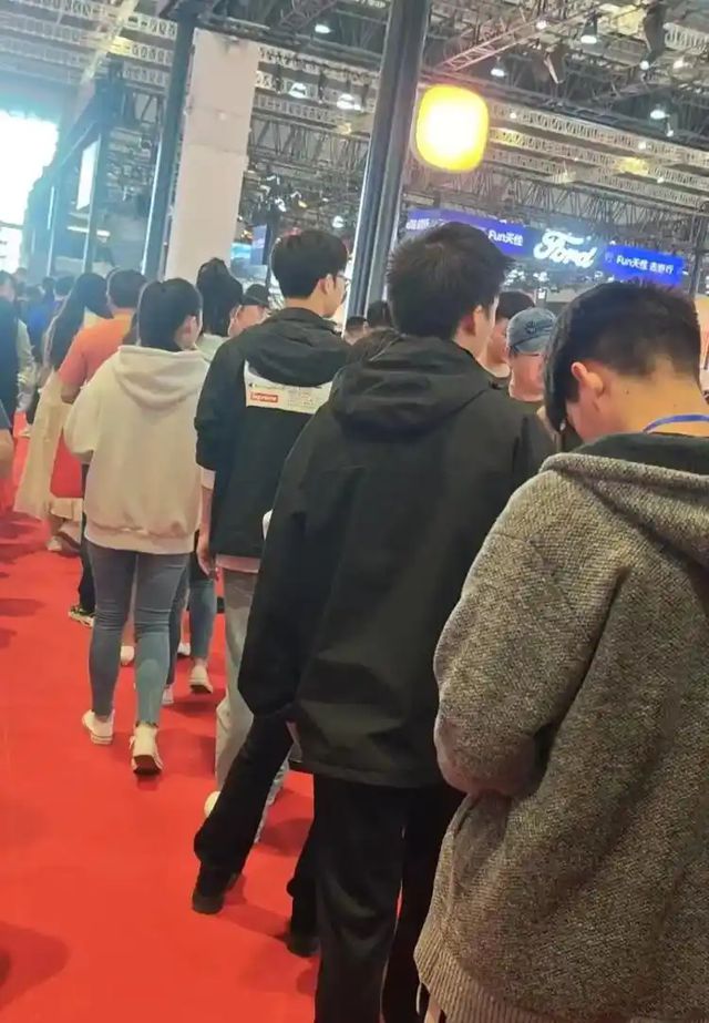 2025 上海车展上,人们排队领取小米“限量款”棒球帽和矿泉水。 图源:红星新闻