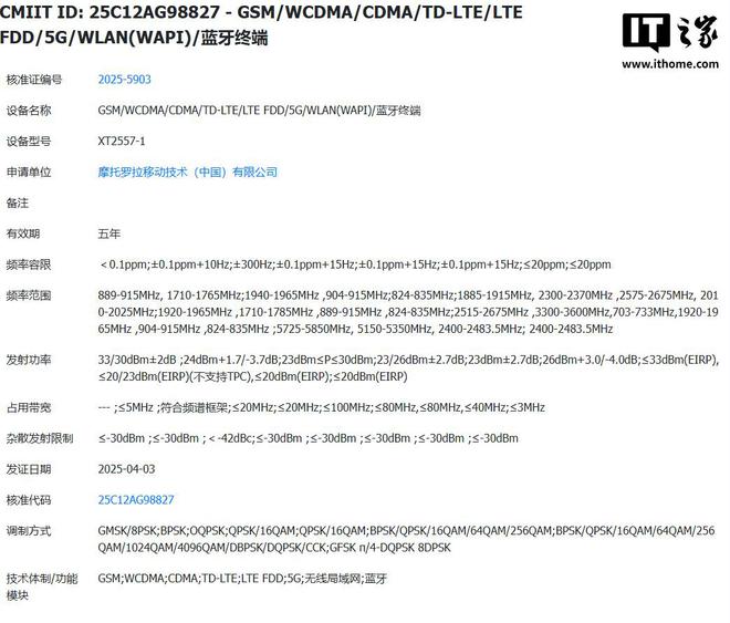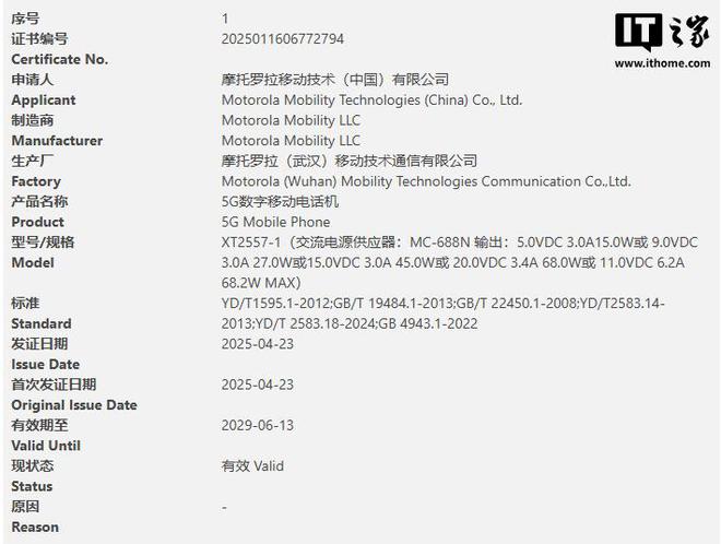IT 之家 4 月 24 日消息,型号为“XT2557-1”的摩托罗拉手机通过中国强制性产品认证(3C 认证),页面信息显示该机搭配 MC-688N 充电器,支持 68W 有线快充。