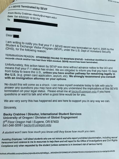 俄勒冈大学发言人 Eric Howald 表示:「过去几周,美国国土安全部以未具体说明的刑事指控,撤销了该校 4 名国际学生的签证状态。学校事先没有收到通知,也不知道指控的具体细节。」