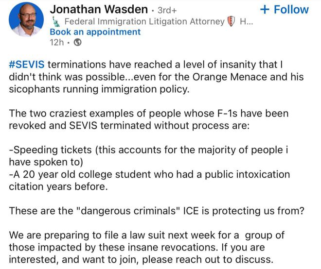 然而 4 个月后,他收到了 SEVIS 的撤销通知,此时他已经工作一年。