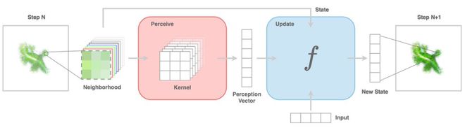 例如,Mordvintsev 等人提出的通用 NCA 架构可被概念化为一种「带有逐单元 dropout 的循环残差卷积神经网络」。
