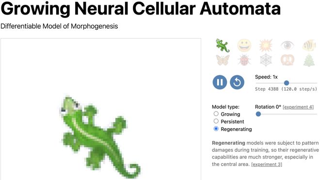 当研究者引入人为破坏(例如切断壁虎的尾巴)时,基于扩散的 NCA 展现出自发的再生能力,而传统的生长型 NCA 则需要专门训练才能实现类似效果。