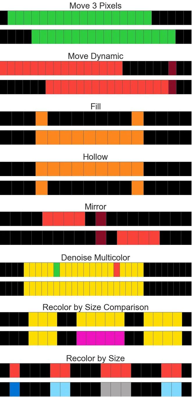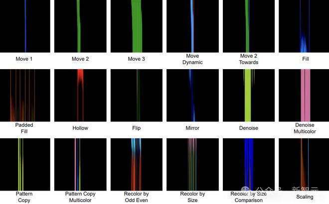 每张图像的顶行像素是输入。随后的像素行展示了 NCA 在尝试将输入转换为目标时的中间步骤。底行像素代表了 NCA 的最终输出。