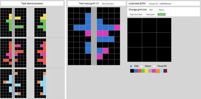 原版 NCA:左图可以看到展示任务特点的输入/输出对;中间是当前的测试输入网格;右侧则是用来构建对应输出网格的控制选项