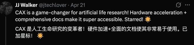 X 用户 JJ Walker 星标推荐 CAX,表示 CAX 将颠覆人工生命研究,更新后的版本既快又好用。