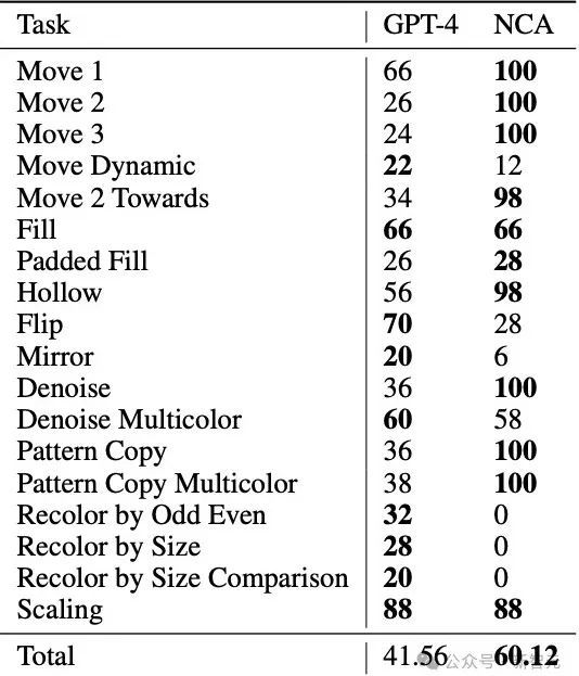 在 1D-ARC 简化数据集上,NCA 准确率达 60.12%,优于 GPT-4 的 41.56%。