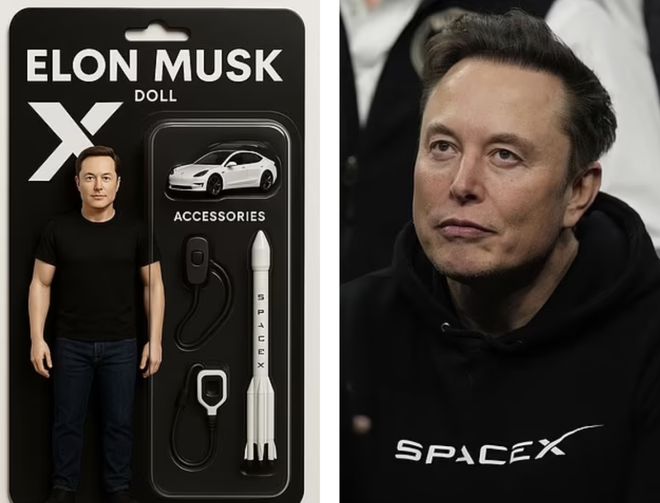 马斯克的玩偶旁边,搭配着特斯拉汽车,还有一枚 SpaceX 火箭。