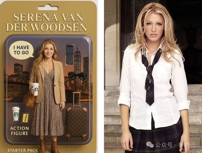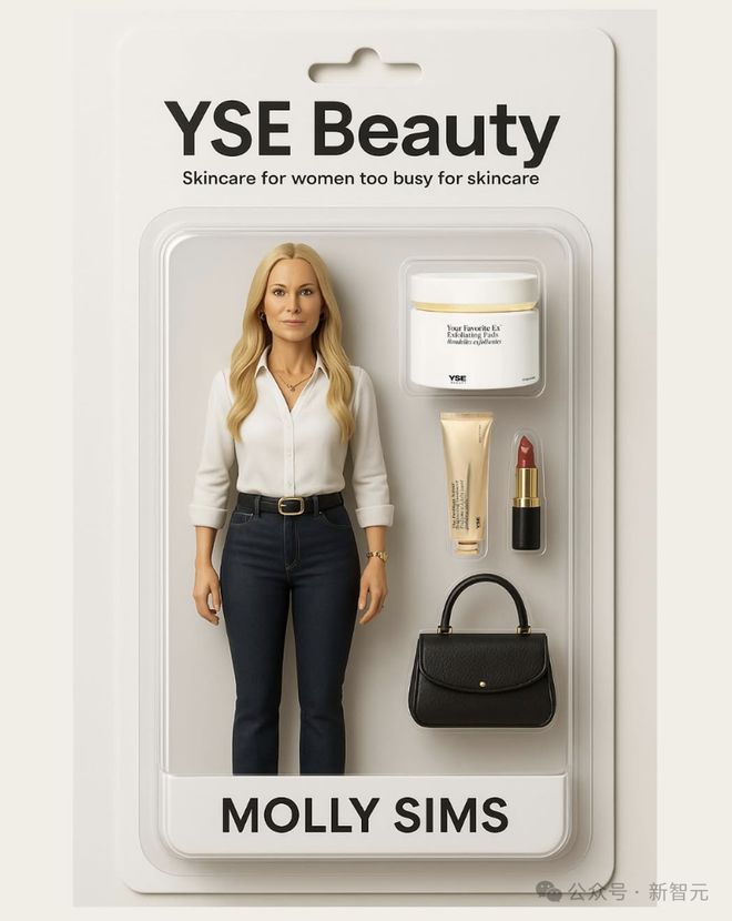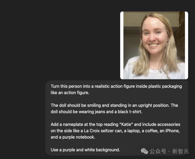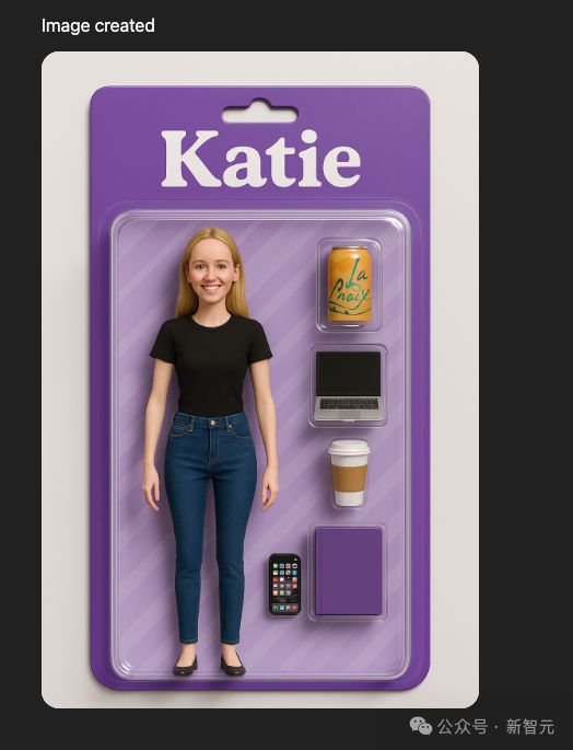 比如「把我变成装在塑料包装里的玩偶,穿着牛仔裤和黑色T恤,旁边配上 LaCroix 苏打水、咖啡、电脑、手机和笔记本,紫色和白色背景,在包装盒上写上我的名字 Katie」。