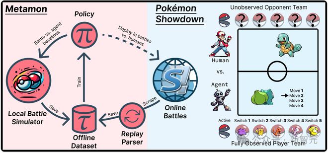 研究团队开发了一个名为 Metamon 的平台,它使用来自 Pokémon Showdown(以下简称 PS)的人类游戏数据集来启用离线 RL 工作流。
