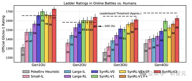 在图中展示了 Glicko-1 阶梯分数及其评分偏差。柱状图标签标注的是 GXE(胜率期望)统计数据。