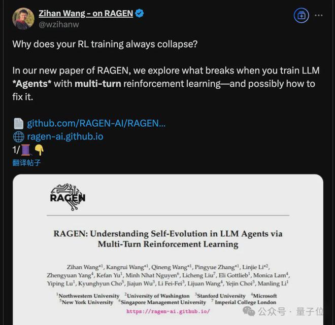新强化学习框架 RAGEN,作者包括 DeepSeek 前员工 Zihan Wang、斯坦福李飞飞团队等,可训练 Agent 在行动中深度思考。