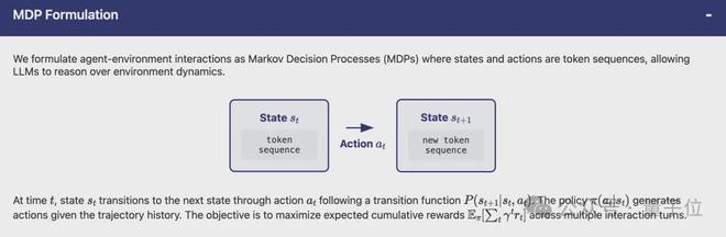 将 Agent 与环境的交互表述为马尔可夫决策过程(MDP),其中状态和动作是 token 序列,从而允许在环境动态上推理。