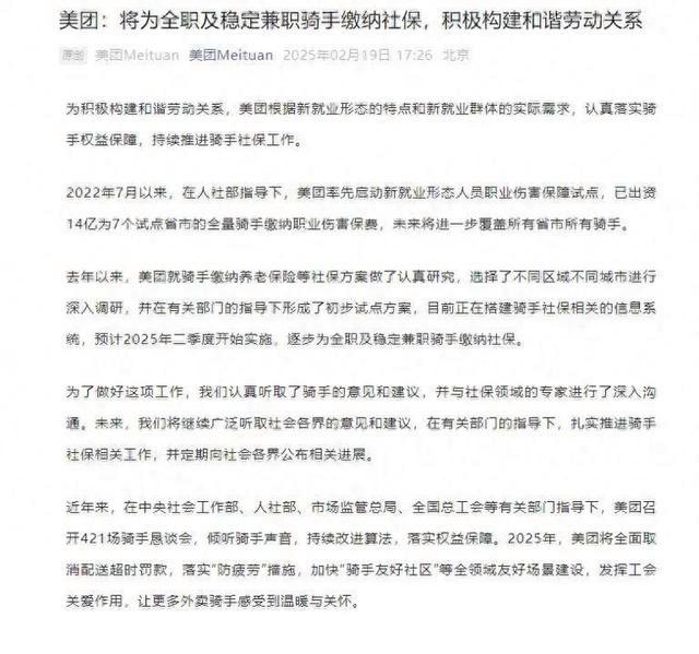 2 月 19 日下午,“美团 Meituan”微信账号发文表示,正在搭建骑手社保相关的信息系统,预计自 2025 年第二季度开始实施,逐步为全职及稳定兼职骑手缴纳社保。