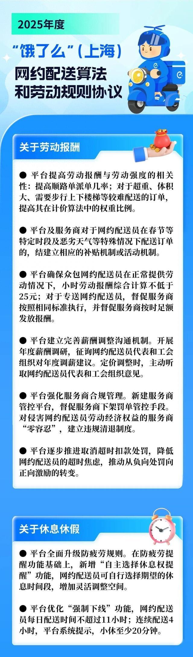 据悉,25 日,“饿了么”(上海)协商算法恳谈会召开,会上形成——《2025 年度“饿了么”(上海)网约配送算法和劳动规则协议》。
