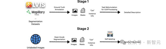 阶段一,是从分割数据集扩展。利用现有分割数据集短标签(猫),通过视觉-语言模型生成丰富的描述(灰色短毛猫,耳朵直立。