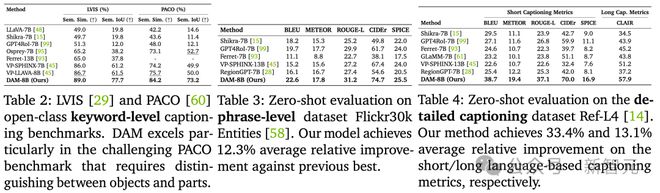 此外,零样本评估在详细描述数据 Ref-L4 上,DAM 在基于短/长语言的描述指标上分别实现了 39.5% 和 13.1% 的平均相对提升。