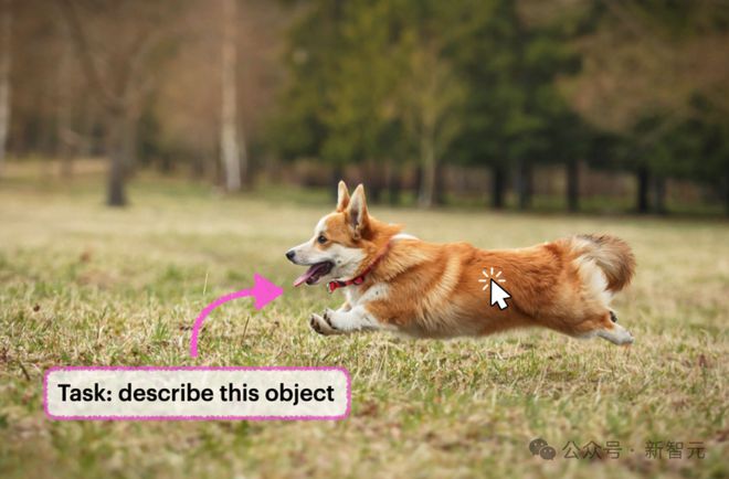 上传一张柯基在草地上欢快奔跑的图,选中柯基,让 DAM 去描述: