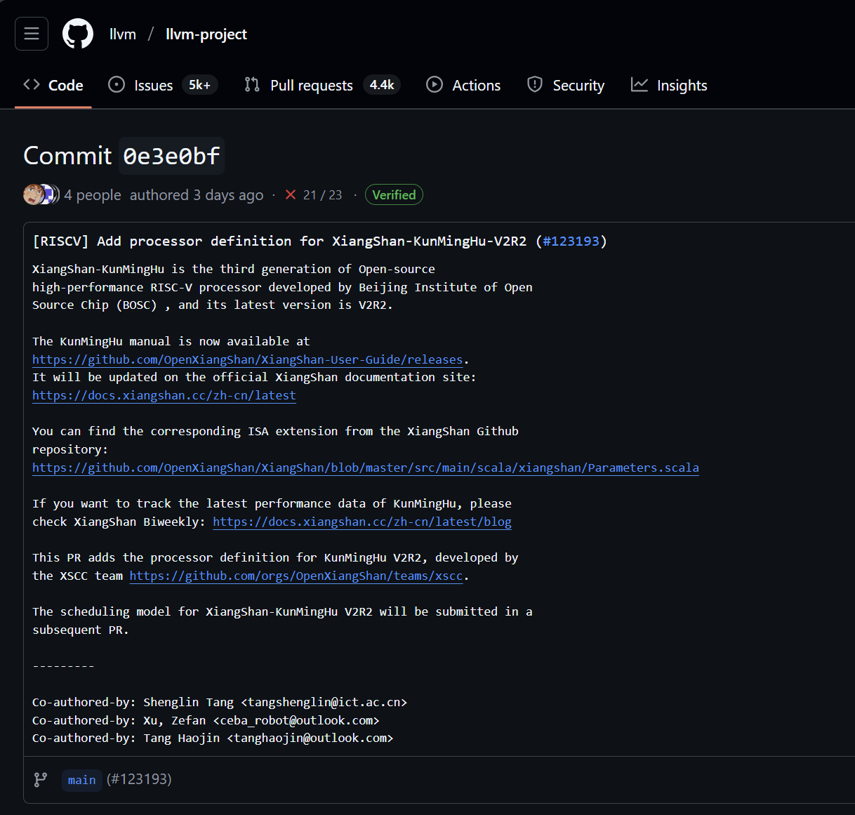 2025 年 4 月 22 日,LLVM 项目接受香山开源 RISC-V 处理器项目提交的昆明湖核心硬件描述代码(Commit 0e3e0bf),标志着 “昆明湖” 高性能 RISC-V 处理器核获得通用编译器项目正式支持。