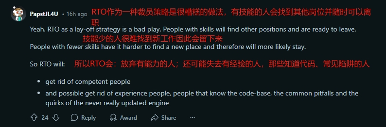 甚至,有同行表示,这其实是一种裁员策略。开发者 habsfan51 说,“我很多朋友仍在老家的游戏行业工作,他们都跟我说这是一种裁员策略:企业借此裁掉那些远程办公(来自其他城市或国家)的员工,因为这些人通常负担不起每周多次前往办公室的费用(尤其是他们住得离办公室很远的话)。说真的,这很让人难过,因为工作室正因强制返岗政策失去资深员工,而这些空缺被初级员工填补。这就给留下来的资深员工和中级员工带来了额外压力,他们不得不更加努力地工作以适应和调整。”