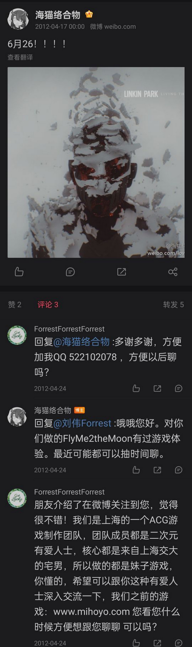 值得一提的是,前不久鹰角的创始人海猫曾无意间解除了自己社媒的“近半年可见”,有网友发现,疑似大伟哥曾在 2012 年就和海猫进行了互动,表示非常欣赏海猫,并附带了自己的 QQ 号想和海猫聊一聊,而海猫则表示体验过米哈游的作品《FlyMe2theMoon》。
