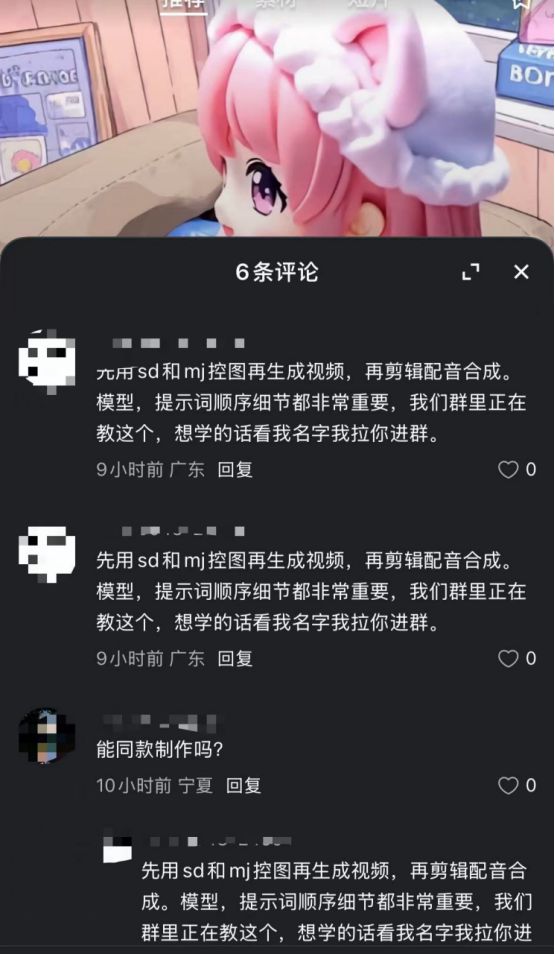 在另一个 AI 产品中,很多创作者的分享下,评论区都有人给自己的社群“打广告”。尤其是在总体互动率并不高的情况下,这样的评论尤其突兀。
