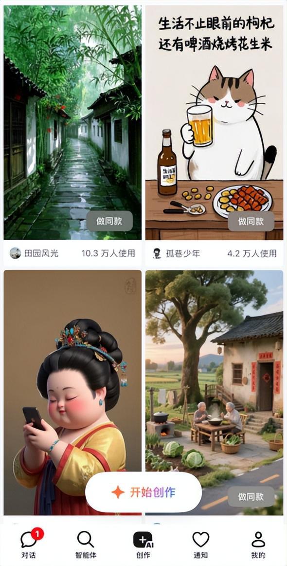 然而,有一个东西是豆包没有的,那就是“社区”。在豆包应用中,可以看到“创作”页面,用户可以分享创作案例,但是其他用户仅能一键“做同款”,无法互动。