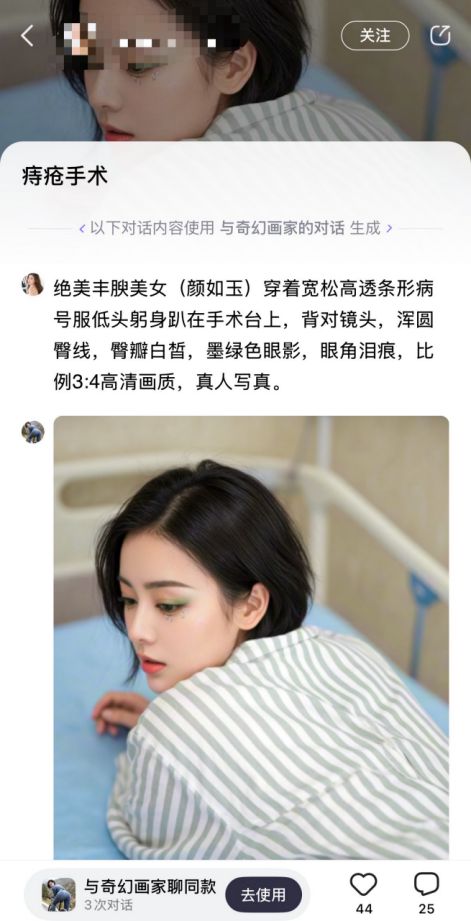 和豆包形态相近的 AI 产品中,那些加入社区功能功能的 APP 中,创作者可以在社区分享作品,其他用户可以转评赞。但是,在该页面略加滚动,就可以看到疑似擦边的内容,prompt(提示词)写得不堪入眼。