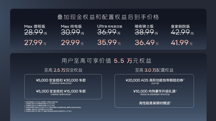 与此同时,针对本次阿维塔 11 焕新上市,阿维塔还推出了重磅购车礼遇,至高价值 55000 元。包括 5000 元定金抵扣 15000-30000 元车款、20000 元 ADS 高阶功能包等额抵扣券、10000 元内饰豪华升级礼遇以及高性能悬架限时赠送。此外,还可享五大基础权益:5 年或 12 万公里整车质保、8 年或 16 万公里三电质保、整车质保期内不限里程免费道路救援、赠送车联网基础流量和每月 10G 座舱娱乐流量、赠送 ADS 进阶功能包。